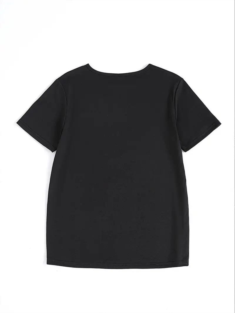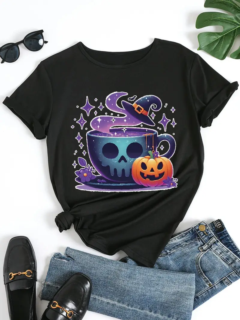 Women’S Black T-Shirt with Halloween-Themed Skull & Pumpkin Design – Short Sleeve